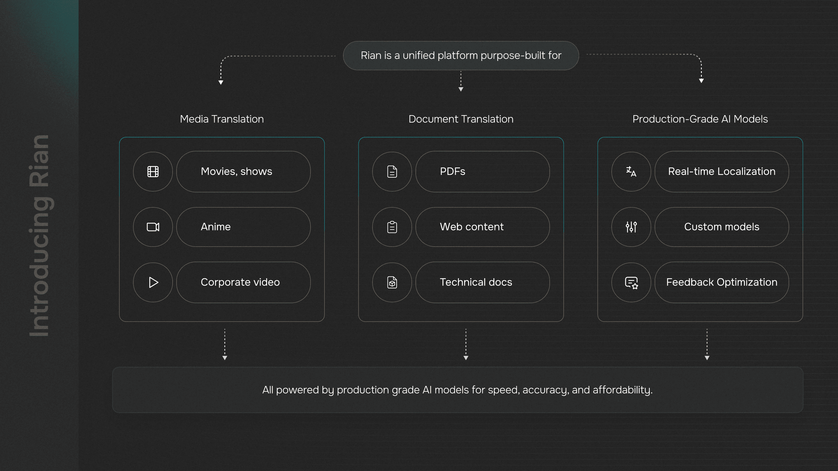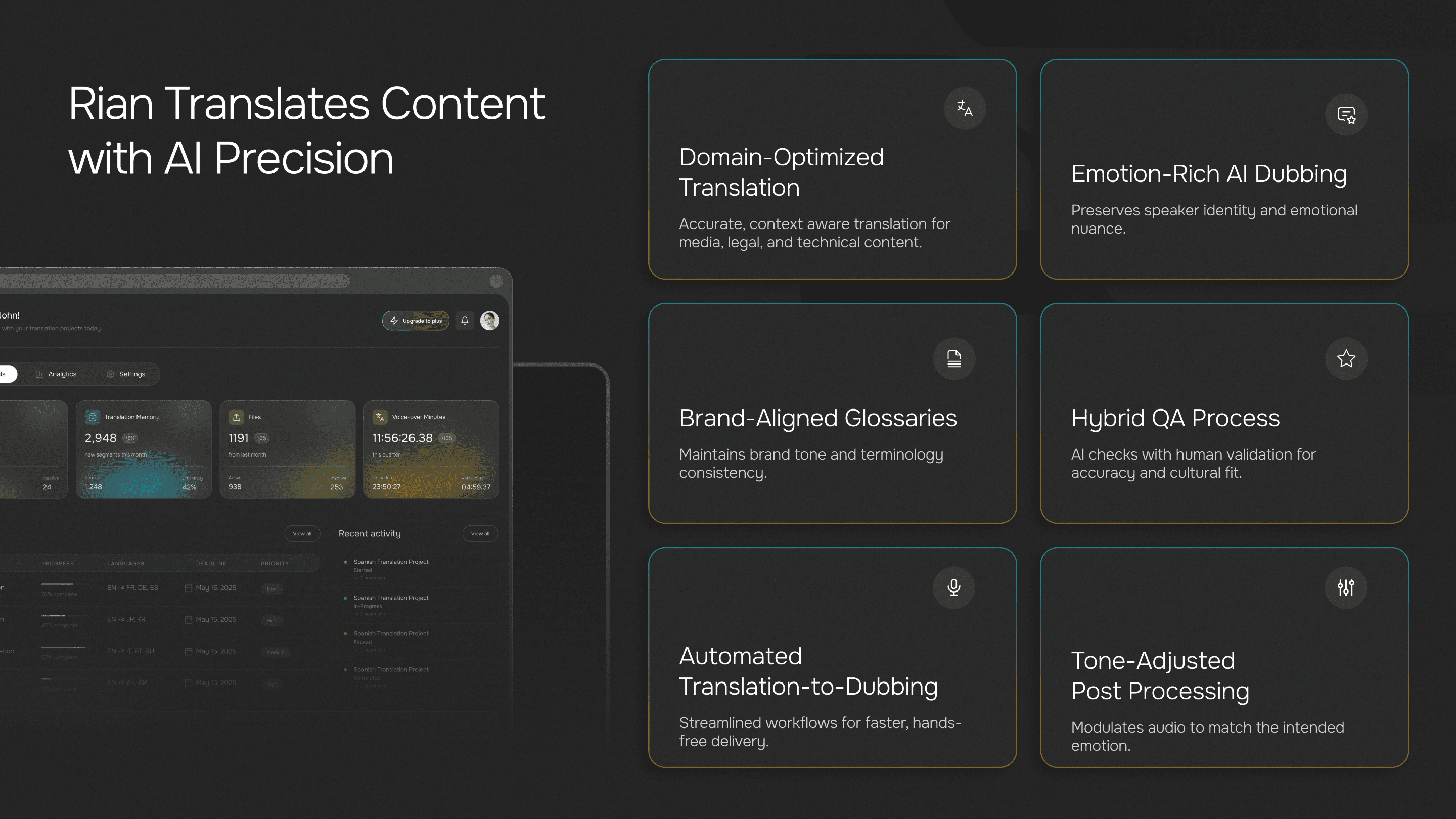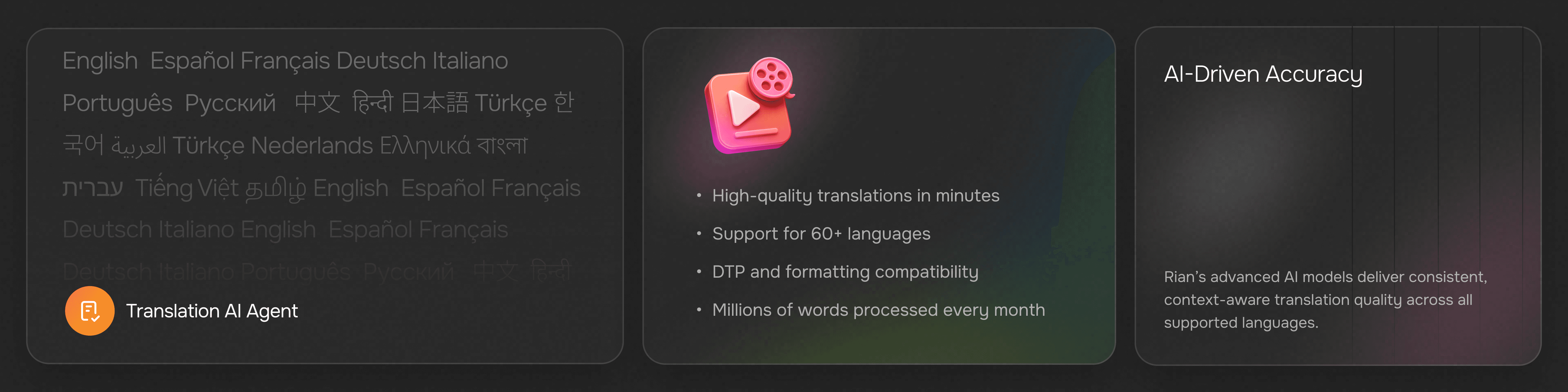 Rian is a hybrid AI-human localization platform providing professional voice-overs, video dubbing, and document translation across 60+ languages, helping global content reach diverse audiences with cultural authenticity