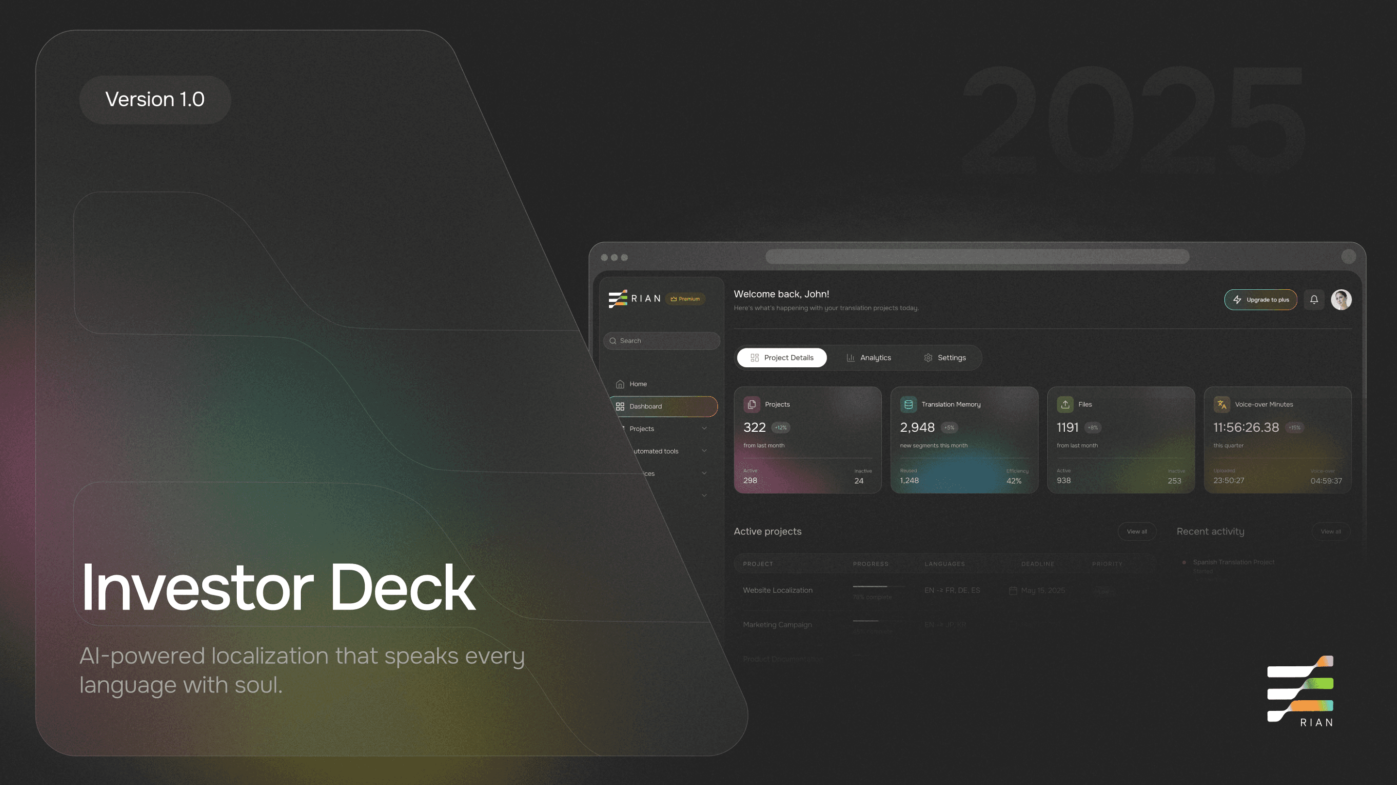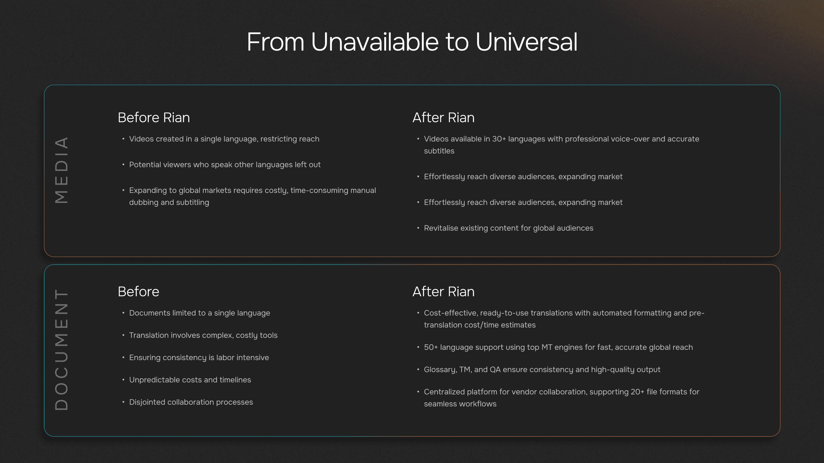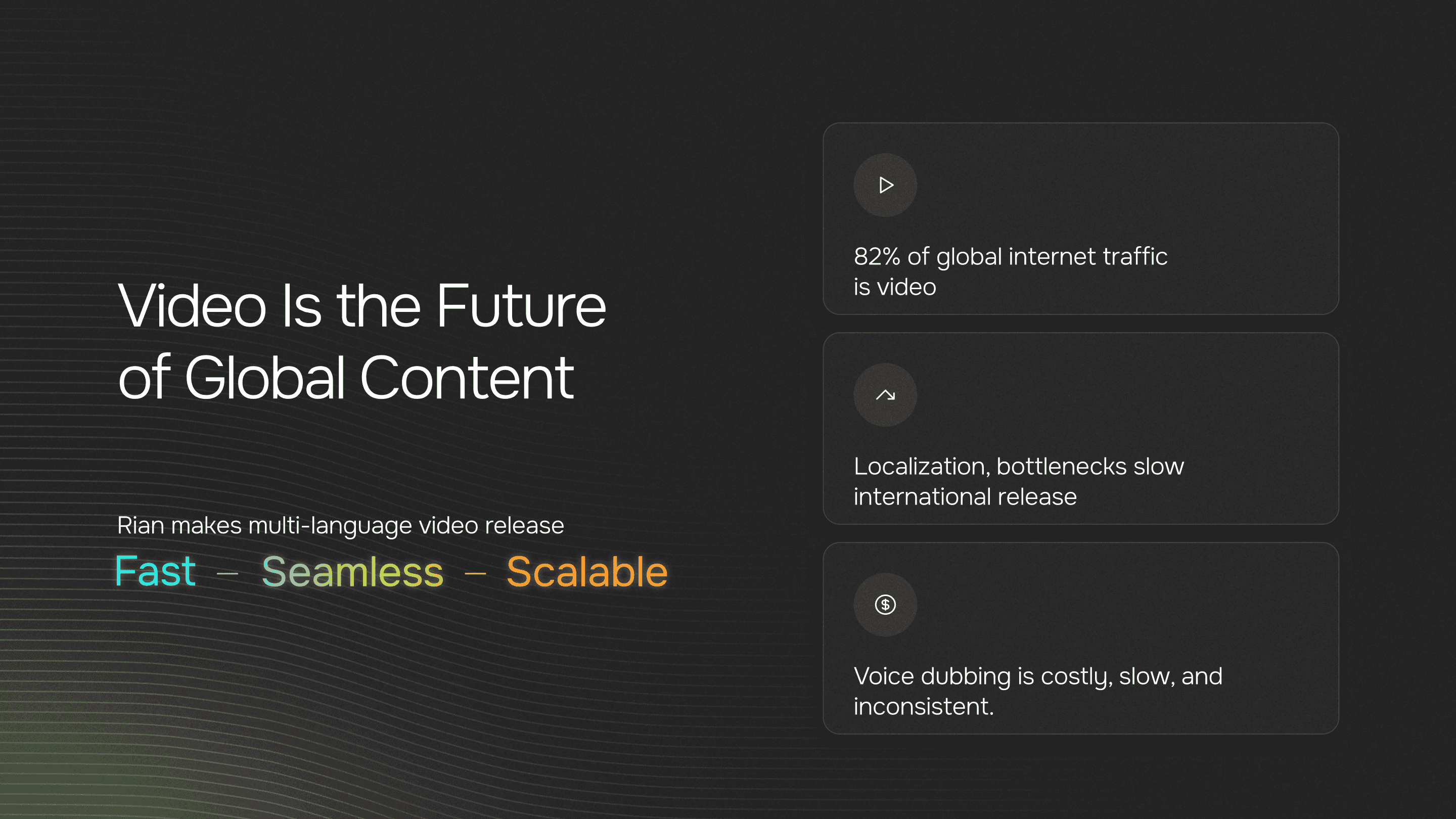 Rian is a hybrid AI-human localization platform providing professional voice-overs, video dubbing, and document translation across 60+ languages, helping global content reach diverse audiences with cultural authenticity