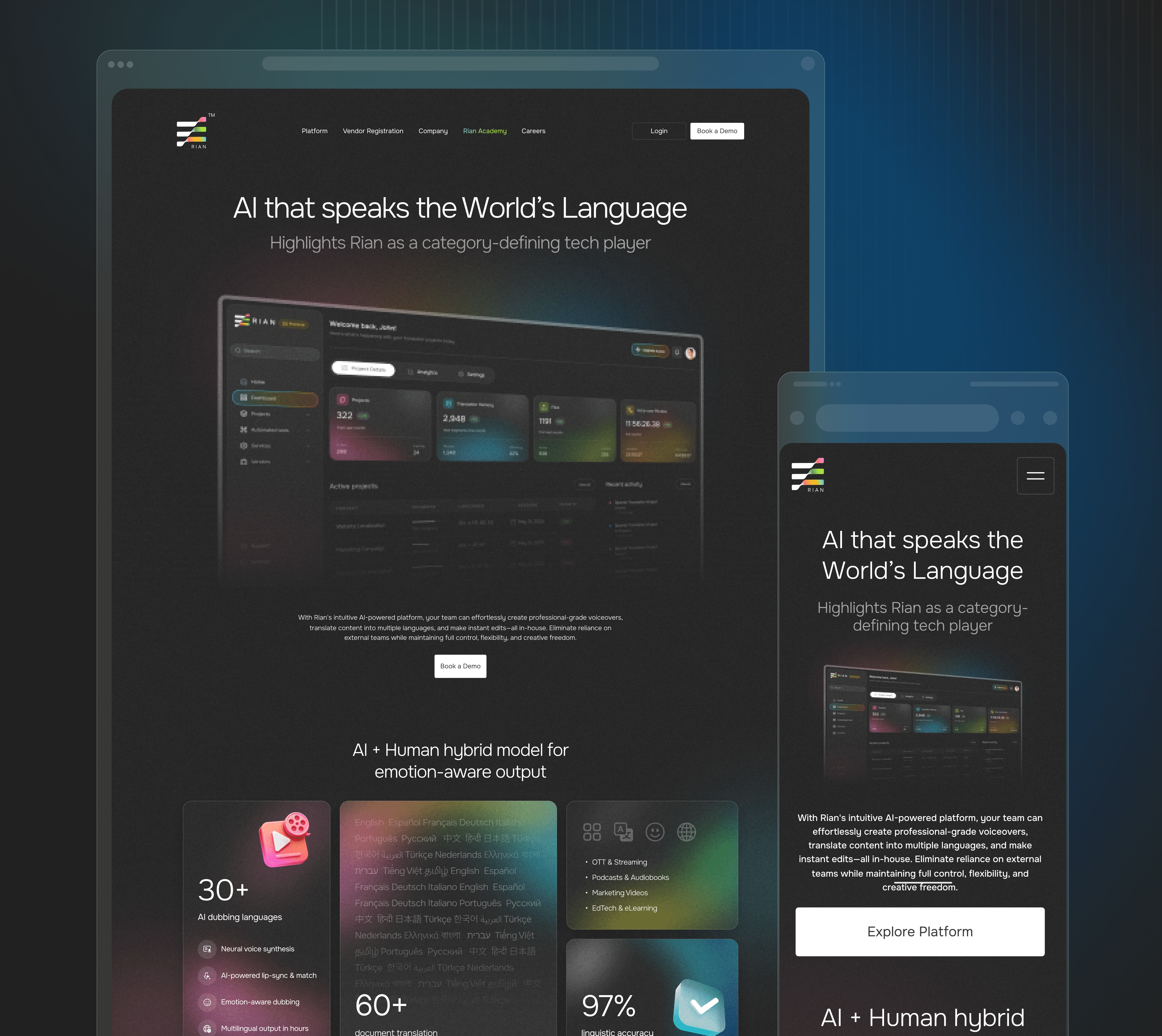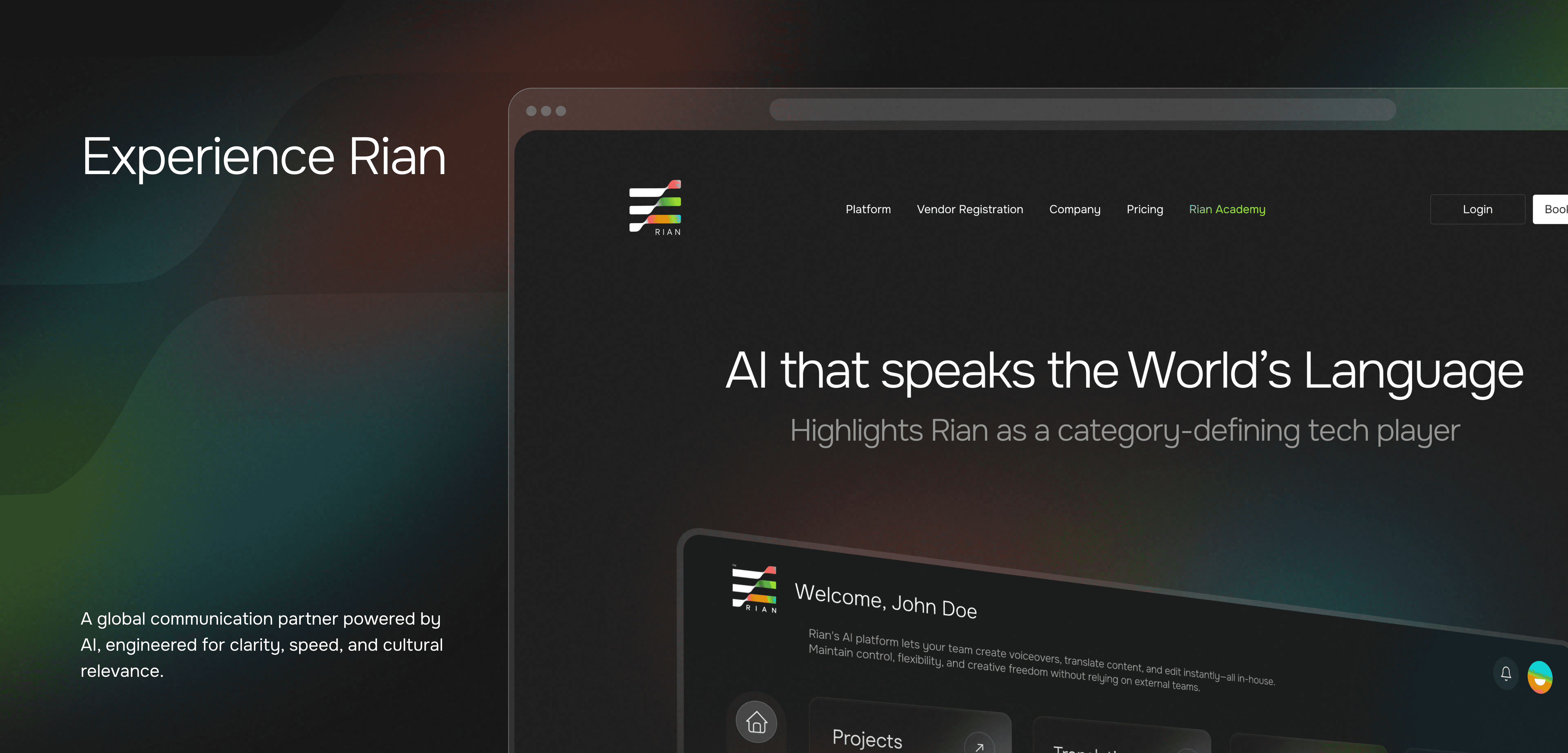 On the website, the design emphasizes focus and hierarchy, introducing Rian’s capabilities with a clean, confident visual tone.